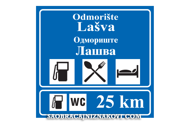 Znak "Odmorište" označava nailazak na mjesto na kome se nalazi odmorišna stanica s uslužnim sadržajima i prostor za odmor putnika. Na znaku su simboli sadržaja odmorišne stanice i udaljenost do odmorišta (slika iznad), odnosno do naredne benzinske pumpe (slika ispod). Kad se (slika ispod) postavlja na početku saobraćajne trake za isključivanje, ispod simbola sadržaja odmorište stanice nalazi se kosa srelica udesno. Znak postavljen na autoputu zelene je boje, na brzom putu je plave boje, a na ostalim putevima žute je boje.