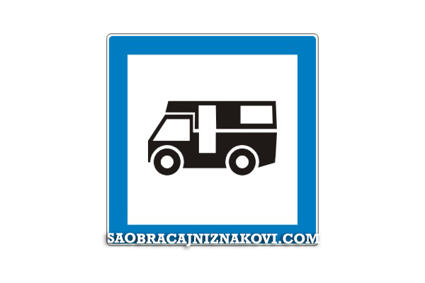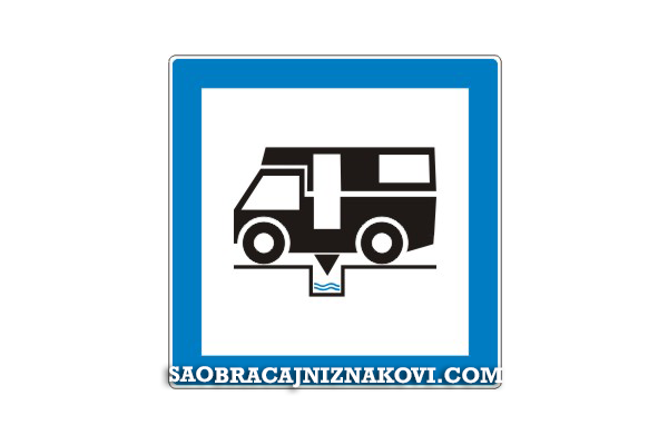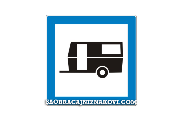 Znak "Teren za kampiranje pod šatorima" označava blizinu terena ili teren uređen za kampiranje pod šatorima, boravak u prikolicama ili vozilima te mjesto na kojem se ispuštaju otpadne voze iz kamperskih vozila.
