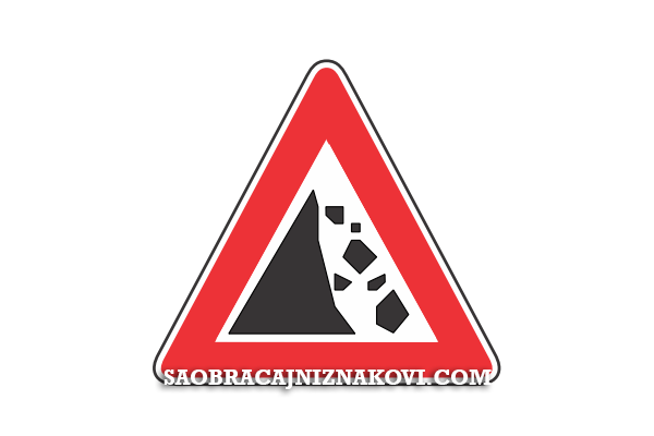 Znak "Odron kamenja" označava nailazak na deo puta na kojem postoji opasnost od odrona kamenja i prisustva kamenja sa desne strane puta, odnosno sa leve strane puta.